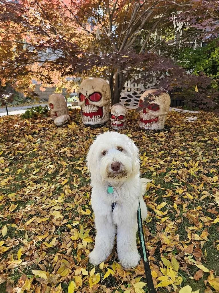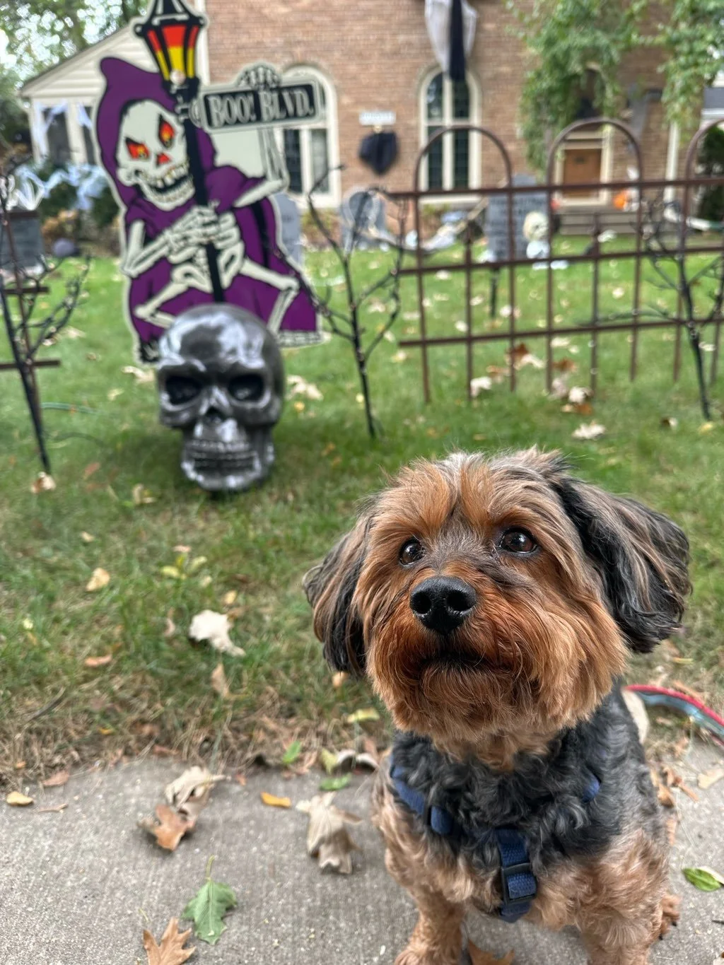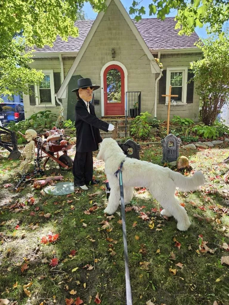 When you're out on a walk with your pet during the Halloween season, it's essential to be mindful of yard decorations you may encounter along the way. Some of these decorations can be quite elaborate and may startle your pet. If you notice your dog becoming anxious or reactive to certain decorations, use positive reinforcement techniques. Reward your pet for calm behavior and gently redirect their attention away from the decorations. In some cases, it may be best to cross the street or take an alternative route to avoid particularly frightening displays. Remember that your pet's comfort and safety should always be the top priority during walks, so be prepared to adapt your route if needed to ensure a stress-free and enjoyable experience for both you and your furry companion.
