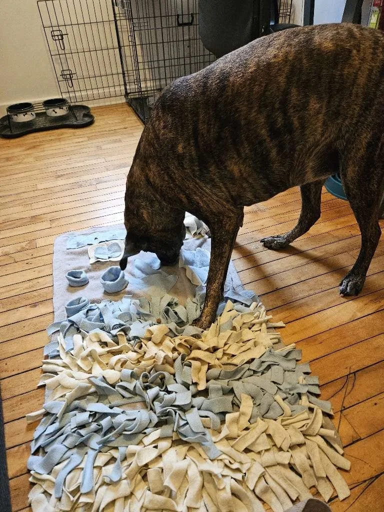 Snuffle mats are a wonderful enrichment tool for dogs that taps into their innate sniffing instincts. These mats consist of a base with fabric strips or fleece tied to it, creating a textured surface. The idea is to hide small treats or pieces of kibble within the fabric, requiring your dog to use their nose to sniff out and find the hidden treasures. Snuffle mats mimic the foraging behavior that dogs would display in the wild when searching for food. By engaging in this activity, your dog is mentally stimulated as they actively use their sense of smell to locate the treats. It provides them with a challenging and rewarding experience. Snuffle mats are particularly beneficial for dogs that have a high energy level or need mental stimulation, as it helps to channel their energy in a positive and engaging way. Additionally, snuffle mats can be used as a slow feeder, as they encourage dogs to eat their meals more slowly and mindfully. This not only adds mental stimulation but can also help prevent digestive issues.