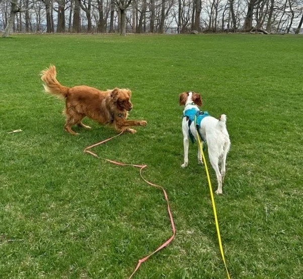 A play bow is a distinct posture displayed by dogs, characterized by the front end lowered towards the ground while the hindquarters remain raised. This body language is often observed during social interactions and can serve multiple purposes, including initiating play and diffusing tension. When a dog performs a play bow, it communicates a friendly and non-threatening intent, inviting another dog or even a human to engage in play. The lowered front end and raised hindquarters position can indicate a willingness to engage in interactive and joyful activities. In addition to its role in play initiation, a play bow can also serve as a calming signal in potentially tense situations. By assuming this posture, dogs can convey their intention to defuse tension and establish a more relaxed atmosphere. Recognizing and responding appropriately to a play bow can help foster positive social interactions and create a safe and enjoyable environment for dogs to engage in playful behavior.
